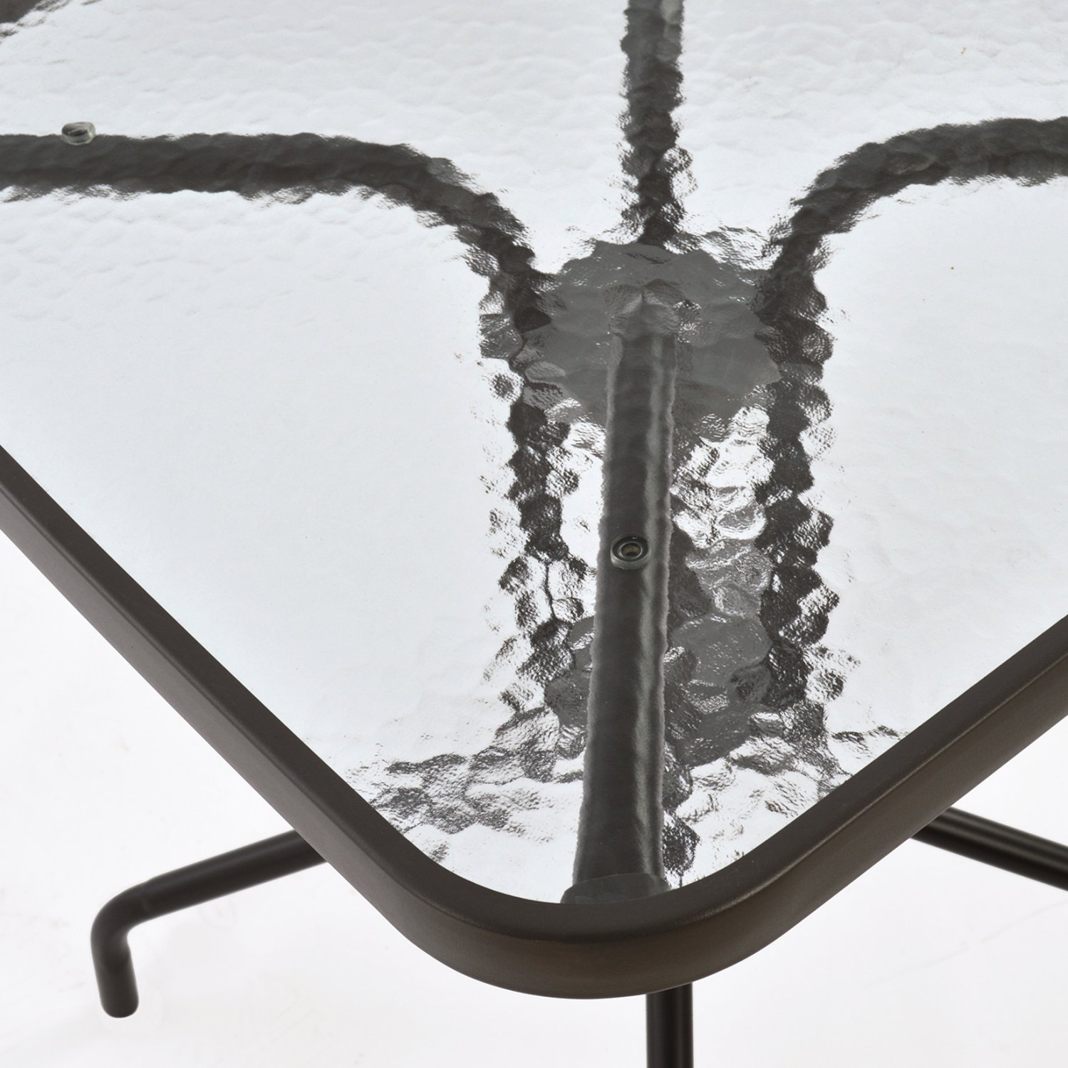 Ένα τραπέζι μεταλλικό εξωτερικού χώρου σε χρώμα καφέ, με ενσωματωμένο τζαμί ασφάλειας (secure).