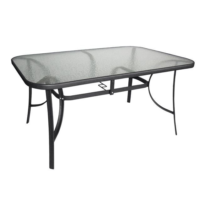 Ένα τραπέζι μεταλλικό εξωτερικού χώρου σε χρώμα γκρι-ανθρακί, με ενσωματωμένο τζαμί ασφάλειας (secure).