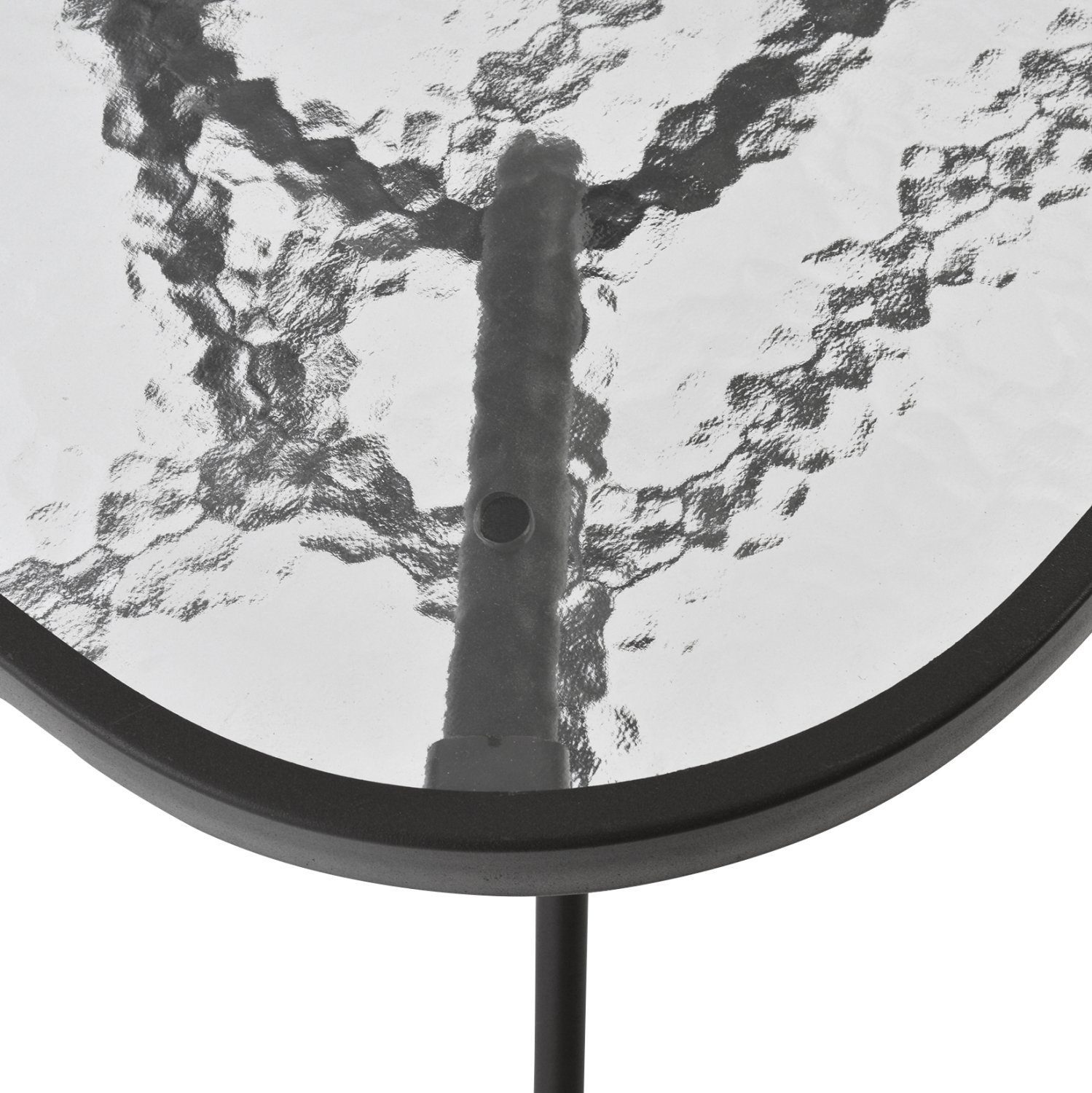 Ένα τραπέζι μεταλλικό εξωτερικού χώρου σε χρώμα γκρι-ανθρακί, με ενσωματωμένο γυαλί ασφαλείας (tempered).