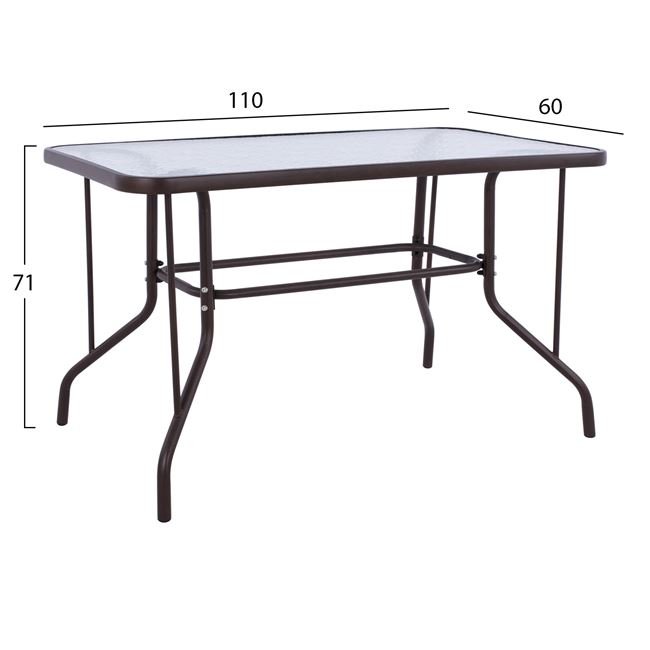 Ένα τραπέζι μεταλλικό εξωτερικού χώρου σε χρώμα καφέ, με ενσωματωμένο γυαλί ασφαλείας (tempered).
