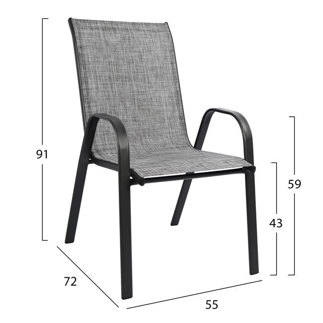Δύο πολυθρόνες εξωτερικού χώρου από μεταλλικό σκελετό σε γκρι χρώμα με textilene 2×1 μεγάλης αντοχής σε ήλιο και βροχή.