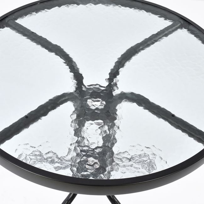 Ένα τραπέζι μεταλλικό εξωτερικού χώρου σε χρώμα γκρι-ανθρακί, με ενσωματωμένο τζαμί ασφάλειας (secure).