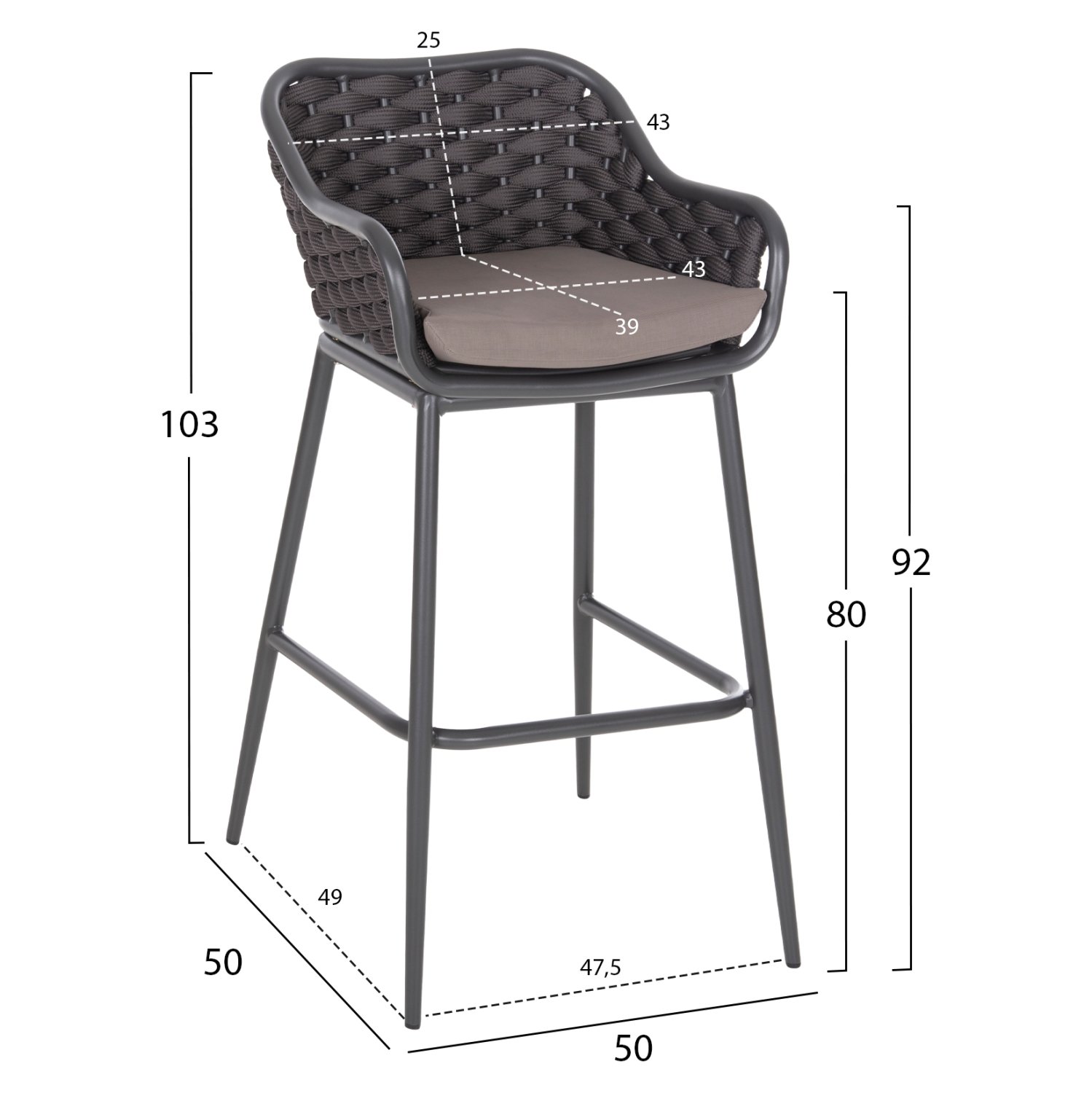 Το σκαμπό HM5862.01, κυρίως για επαγγελματική χρήση, είναι αυτό που ψάχνετε για ένα τέτοιο έπιπλο! Μοντέρνο, άνετο και σταθερό! Η διχρωμία του ΑΝΘΡΑΚΙ σκελετού με την ΚΑΦΕ επένδυση από σχοινί σε όλη την πλάτη είναι μοναδική. Η πλάτη με τα μπράτσα αποτελούν ένα ενιαίο κομμάτι με κάθετες βέργες που είναι πλεγμένες με σχοινί και αγκαλιάζουν το σώμα, ενώ η πλάτη είναι ψηλότερη από τα μπράτσα. Ο σκελετός είναι ψηλός και τα πόδια ενώνονται μεταξύ τους με μια δοκό που λειτουργεί ως υποπόδιο. Το μαξιλάρι του καθίσματος είναι σε ΓΚΡΙ χρώμα και είναι άνετο. Το σκαμπό αυτό θα αναβαθμίσει αισθητικά τον χώρο που θα το τοποθετήσετε και θα τραβήξει τα βλέμματα χάρη στα υλικά κατασκευής του.