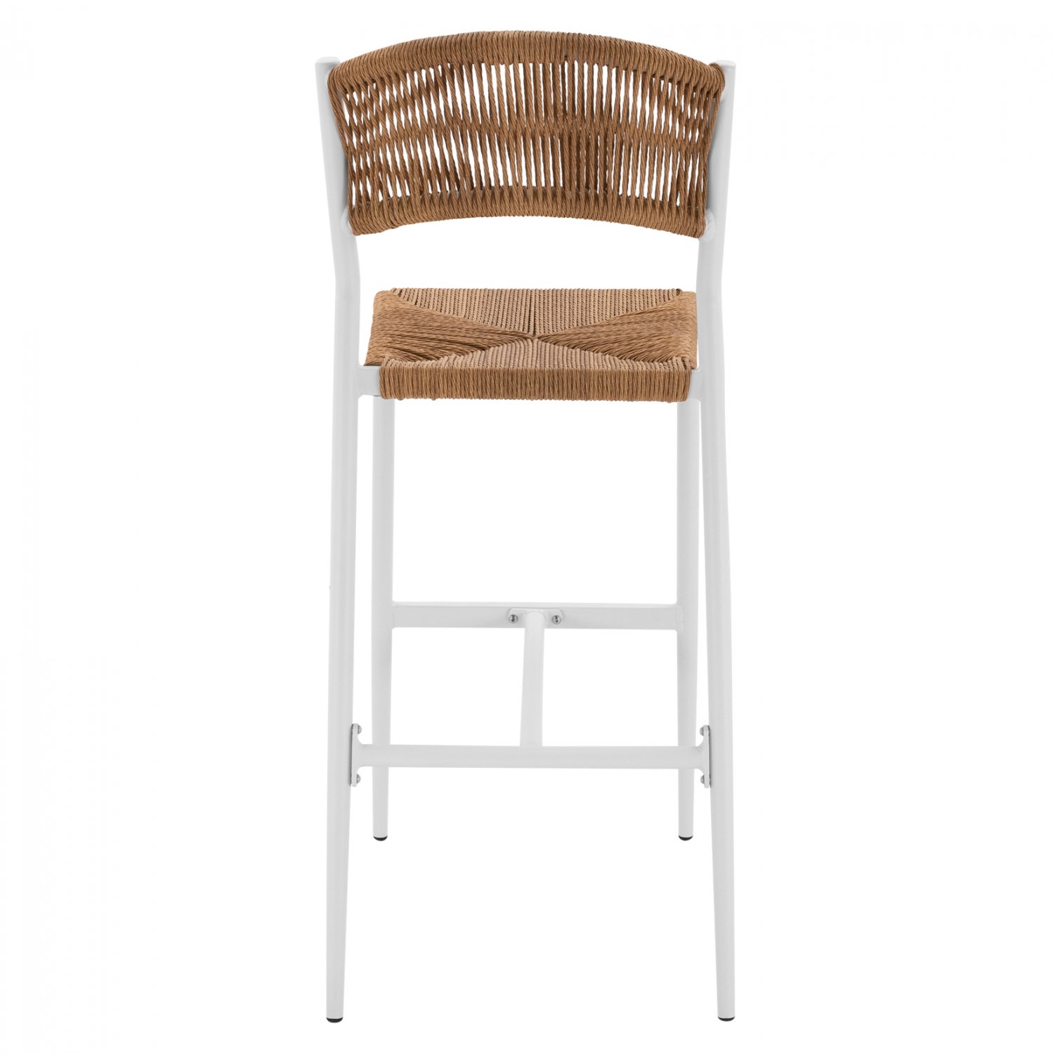 Μοντέρνο σκαμπό bar, κατασκευασμένo από σκελετό αλουμινίου σε λευκή απόχρωση, επενδυμένο με πλεκτό ενισχυμένο PE σχοινί στο κάθισμα και στην πλάτη σε μπεζ απόχρωση.