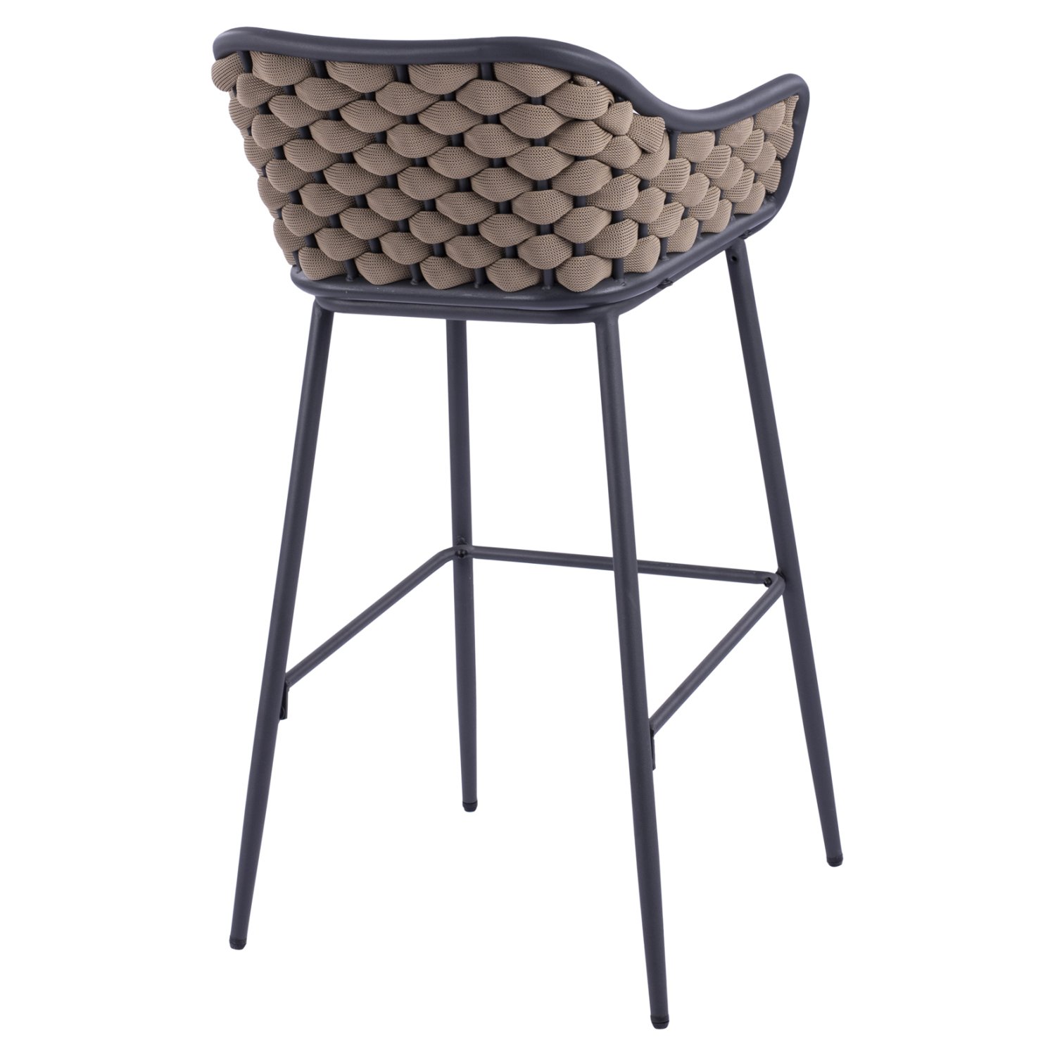 Μοντέρνο σκαμπό με πλάτη και μαξιλάρι, εξωτερικού αλλά και εσωτερικού χώρου, κατασκευασμένο από μεταλλικό σκελετό σε γκρι απόχρωση, επενδυμένο με wicker σχοινί σε μπεζ απόχρωση.