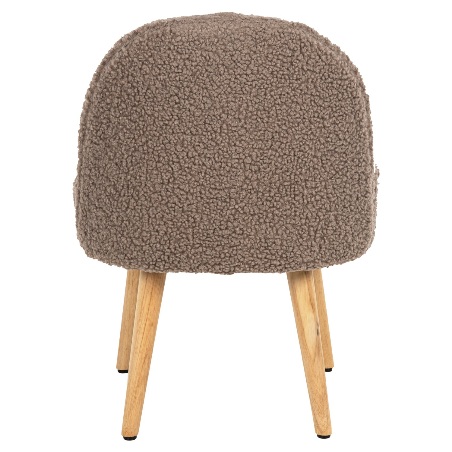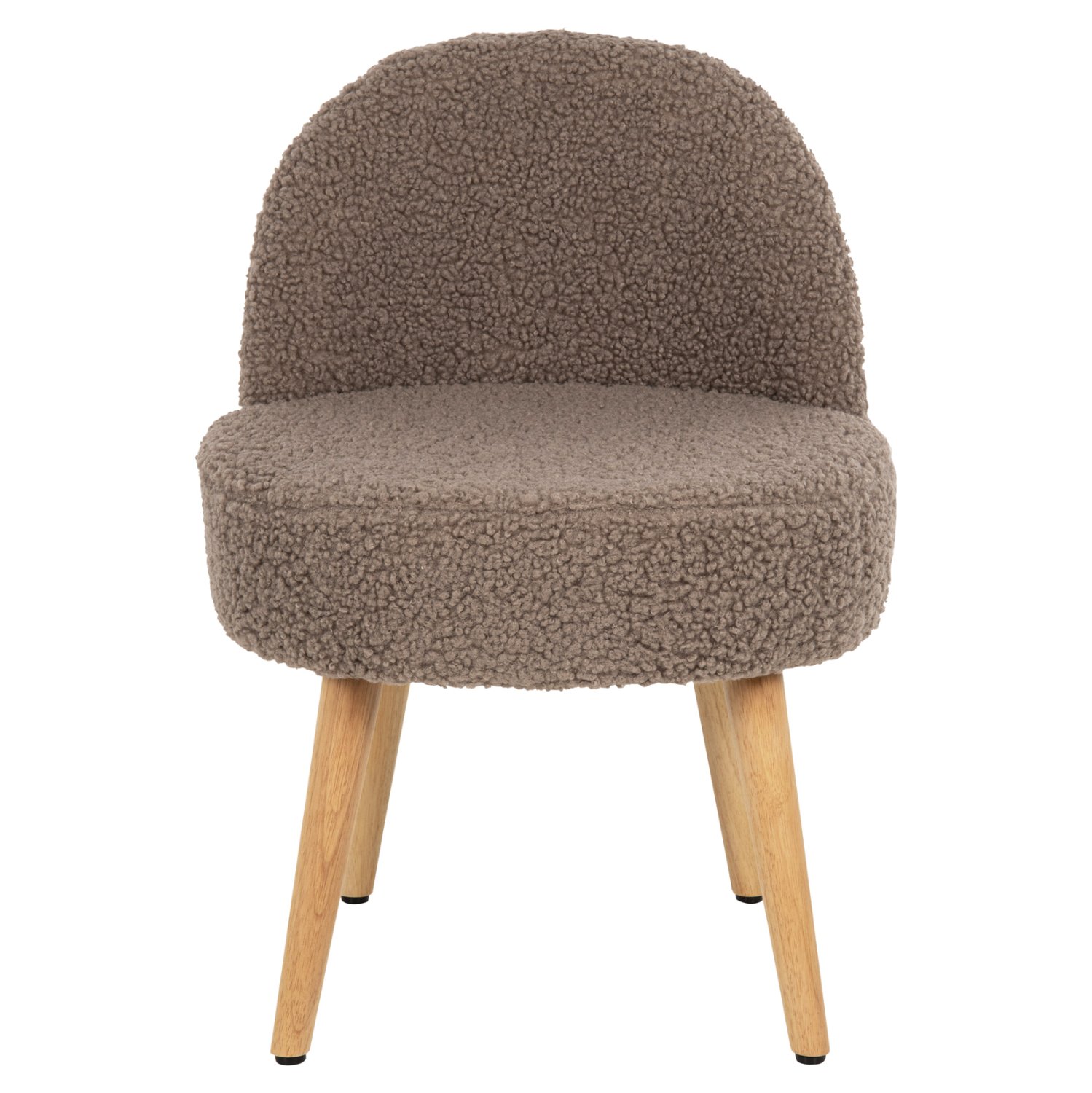 Σκαμπό με πολύ χαμηλή πλάτη YASMINE με επένδυση από ζεστό μπουκλέ ύφασμα σε ανοιχτή ΚΑΦΕ απόχρωση, με ξύλινα πόδια σε φυσική απόχρωση.