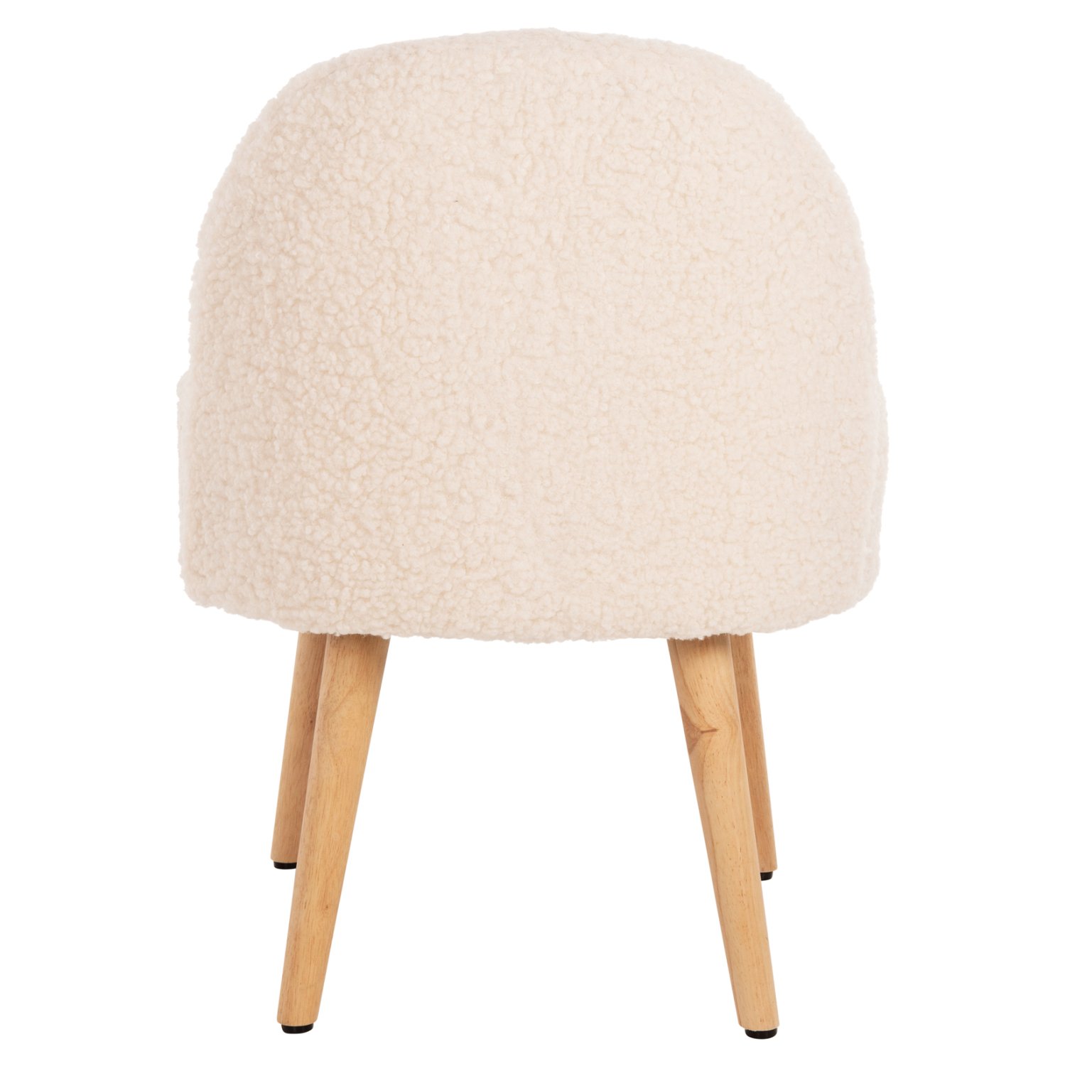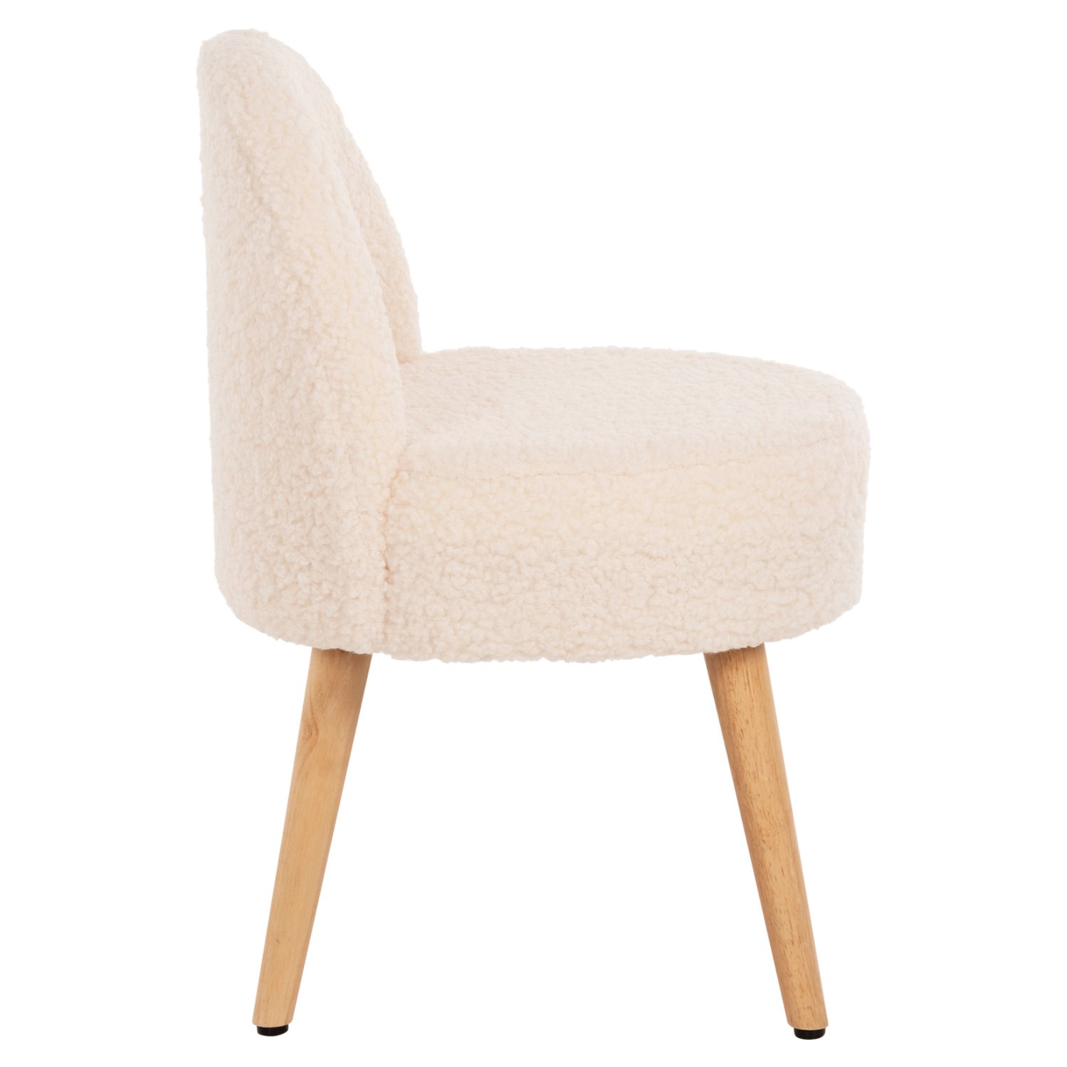 Σκαμπό με πολύ χαμηλή πλάτη YASMINE με επένδυση από ζεστό μπουκλέ ύφασμα σε ΕΚΡΟΥ απόχρωση, με ξύλινα πόδια σε φυσική απόχρωση.