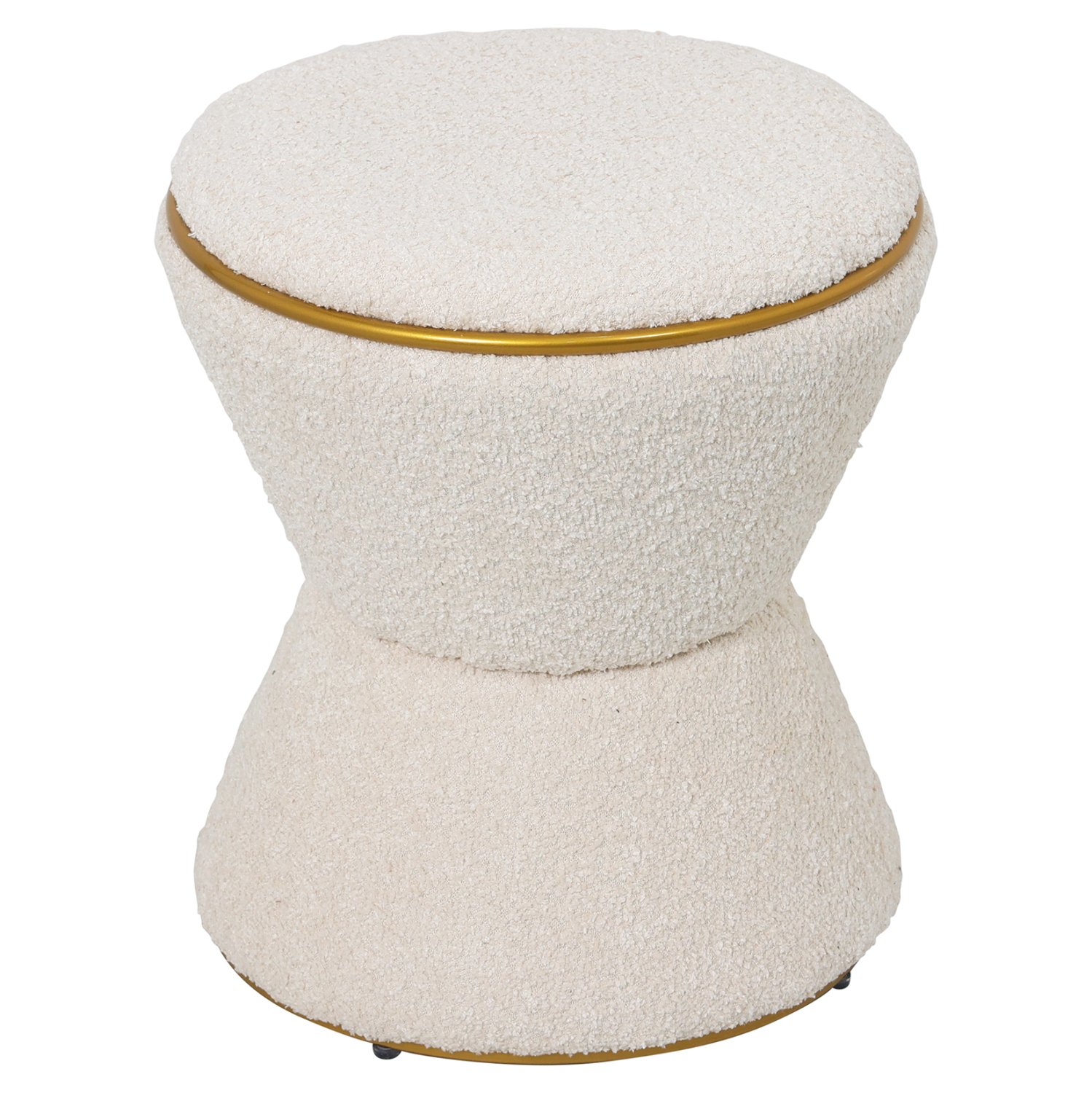 Σκαμπό κυλινδρικό LINNER επενδυμένο με ΕΚΡΟΥ μπουκλέ ζεστό ύφασμα και ΧΡΥΣΗ μεταλλική λεπτομέρεια («δαχτυλίδι») στο κάθισμα και στην βάση.