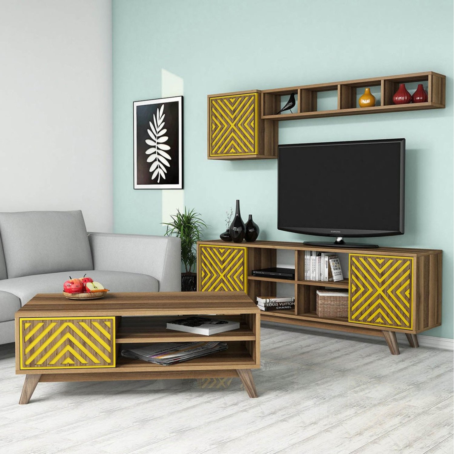 Η σύνθεση ΗΜ11853.04 θα αλλάξει την όψη στο σαλόνι σας και θα σας προσφέρει την αναβάθμιση που θέλετε. Αποτελείται από έναν συνδυασμό επίπλων για την τηλεόρασή σας με μονάδα δαπέδου, επιτοίχιο ράφι και επιτοίχιο ντουλάπι, και ένα τραπεζάκι σαλονιού. Χαρακτηριστικό όλης της σύνθεσης είναι οι πολλοί χώροι αποθήκευσης και τοποθέτησης αντικειμένων. Όλη η σύνθεση είναι της ίδιας σειράς και τα κυρίαρχα χρώματα είναι το ΚΑΡΥΔΙ και το ΚΙΤΡΙΝΟ.