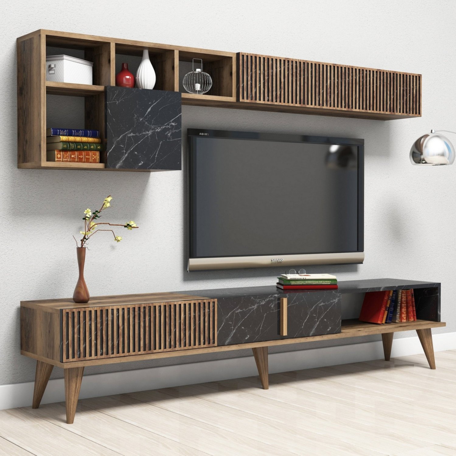 Το ΗΜ9438.03 είναι ένα μοντέρνο και λειτουργικό έπιπλο τηλεόρασης, που θα ομορφύνει το σαλόνι σας! Είναι μακρύ και διαθέτει 2 ντουλάπια με ενιαίο χώρο στην αριστερή πλευρά της κύριας μονάδας δαπέδου που ανοίγουν προς τα κάτω και έναν ανοιχτό χώρο αποθήκευσης στην δεξιά πλευρά. Η σύνθεση ολοκληρώνεται με επιτοίχια ράφια και ντουλάπια που δίνουν άπλετο χώρο είτε για την διακόσμηση σας, είτε για αποθήκευση αντικειμένων. Διαθέτει 4 πόδια στην μονάδα δαπέδου και ένα επιπλέον στο κέντρο για μεγαλύτερη στιβαρότητα, ενώ το έπιπλο έρχεται σε μια πανέμορφη διχρωμία καρυδί με ΜΑΥΡΟ ΜΑΡΜΑΡΟ, και οι διαστάσεις του είναι κατάλληλες για όλες τις τηλεοράσεις εάν θέλετε η τηλεόρασή σας να στηρίζεται σε βάση. Πρόκειται για μια κομψή και ολοκληρωμένη πρόταση για το σαλόνι σας!