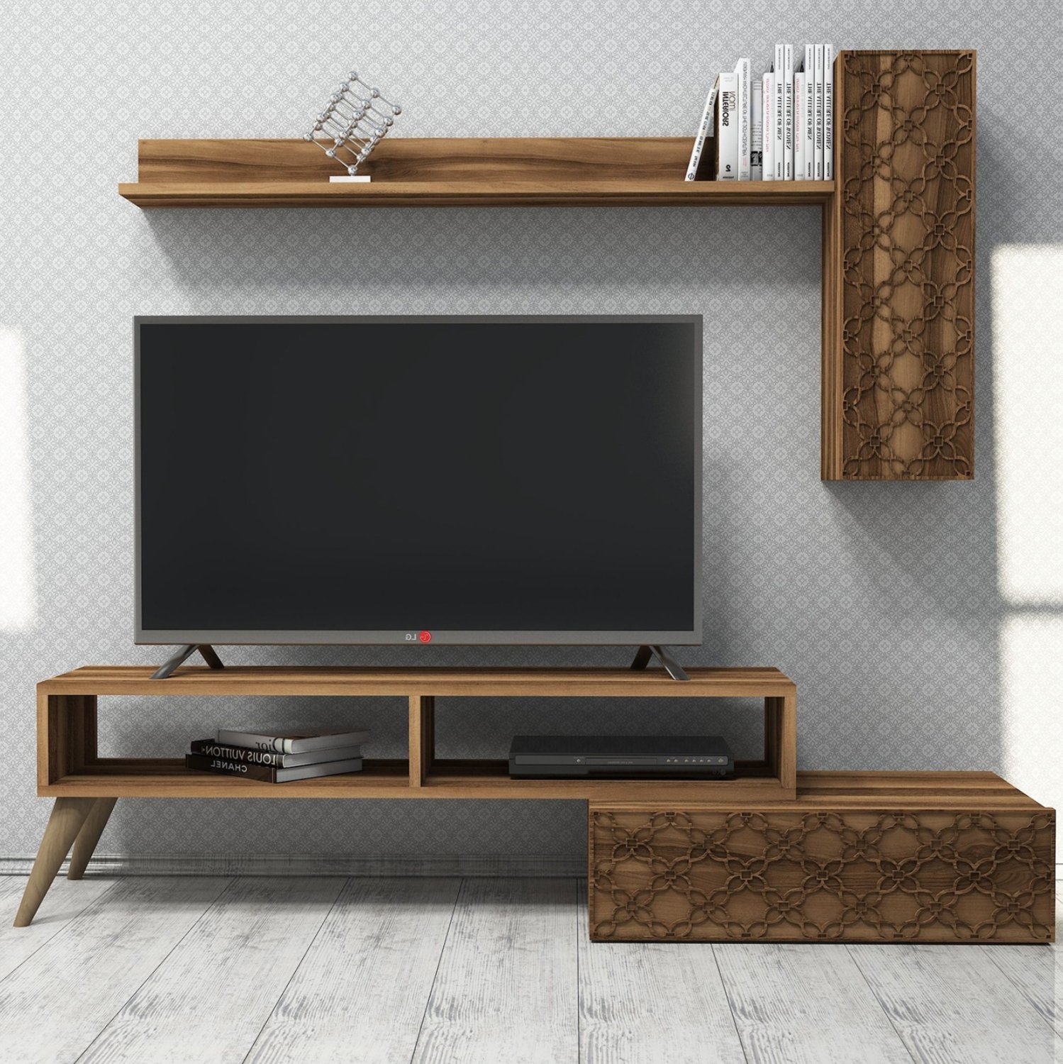 Το ΗΜ9518.03 είναι μια μοντέρνα όσο και πρακτική σύνθεση τηλεόρασης σε ΚΑΡΥΔΙ χρώμα, που θα ομορφύνει το σαλόνι σας! Αποτελείται από το κυρίως έπιπλο στο δάπεδο, το οποίο έχει ορθογώνιο σχήμα, και στηρίζεται σε δύο πόδια στην μία άκρη και σε ένα ντουλάπι με ΚΑΡΥΔΙ πόρτα και όμορφα σχέδια ξύλου στην άλλη άκρη. Η σύνθεση ολοκληρώνεται με ένα μακρόστενο ντουλάπι τοίχου με ΚΑΡΥΔΙ πόρτα με σχέδια ξύλου κι ένα ράφι μέσα, κι ένα εξωτερικό μακρύ ράφι τοίχου. Μια σύνθεση που θα δώσει στο σαλόνι σας μια πραγματικά όμορφη και μοντέρνα όψη.