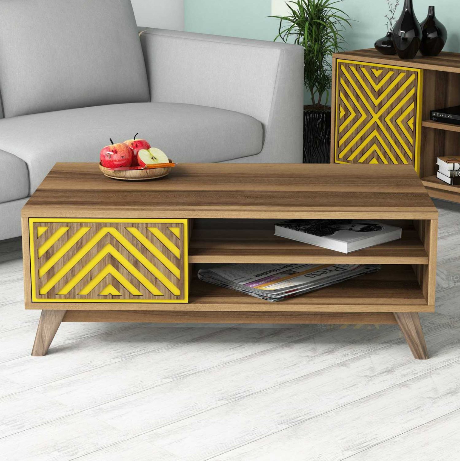 ΗΜ9502.04 τραπεζάκι σαλονιού—– Το τραπεζάκι αυτό είναι ένα πανέμορφο έπιπλο σε χρώμα καρυδί. Το πρακτικό του design θα αλλάξει την εικόνα του σαλονιού ή του καθιστικού σας προς το καλύτερο. Πρόκειται για μια κατασκευή με μια ικανοποιητικού μεγέθους επάνω επιφάνεια. Από κάτω υπάρχουν δύο ράφια και ένα ντουλαπάκι με ΚΙΤΡΙΝΟ πορτάκι. Η κομψότητα, η ποιότητα και το minimal πρακτικό design, είναι κάποια χαρακτηριστικά από το τραπέζι σαλονιού, που έχει φτιαχτεί για εσένα.