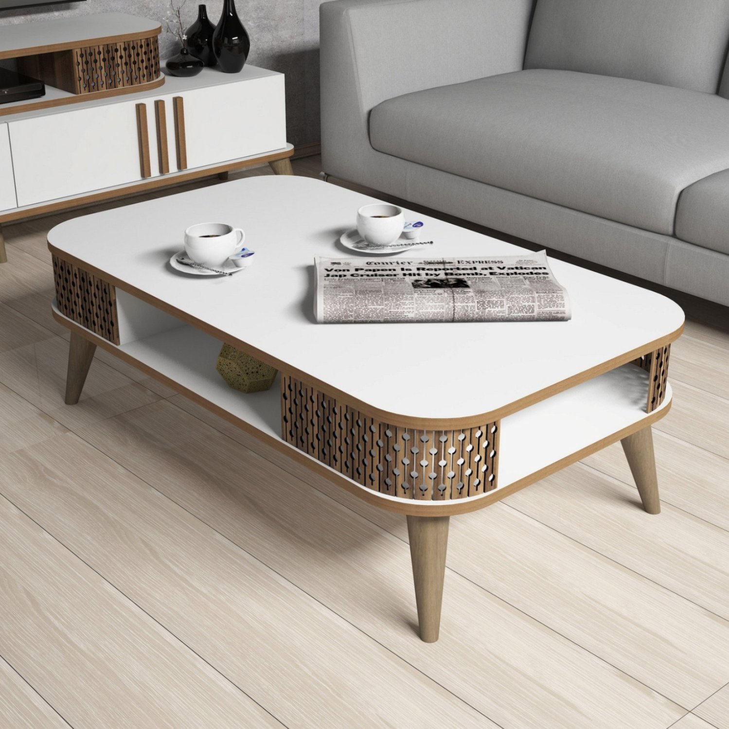 ΗΜ9501.03 τραπεζάκι σαλονιού—– Το τραπεζάκι αυτό είναι ένα όμορφο έπιπλο σε χρώμα ΛΕΥΚΟ. Το όμορφο design του θα αλλάξει την εικόνα του σαλονιού ή του καθιστικού σας προς το καλύτερο. Πρόκειται για μια κατασκευή με μια ικανοποιητικού μεγέθους επάνω επιφάνεια. Από κάτω υπάρχουν 3 ανοιχτοί χώροι για τοποθέτηση αντικειμένων. Το χαρακτηριστικό, όμως, σε αυτό το τραπεζάκι είναι ότι οι γωνίες του είναι στρογγυλεμένες και οι καμπύλες είναι φτιαγμένες με διάτρητο σχέδιο στην μελαμίνη σε χρώμα ΚΑΡΥΔΙ. Η κομψότητα, η ποιότητα και το minimal design χαρακτηρίζουν αυτό το τραπεζάκι, που έχει φτιαχτεί για εσένα.