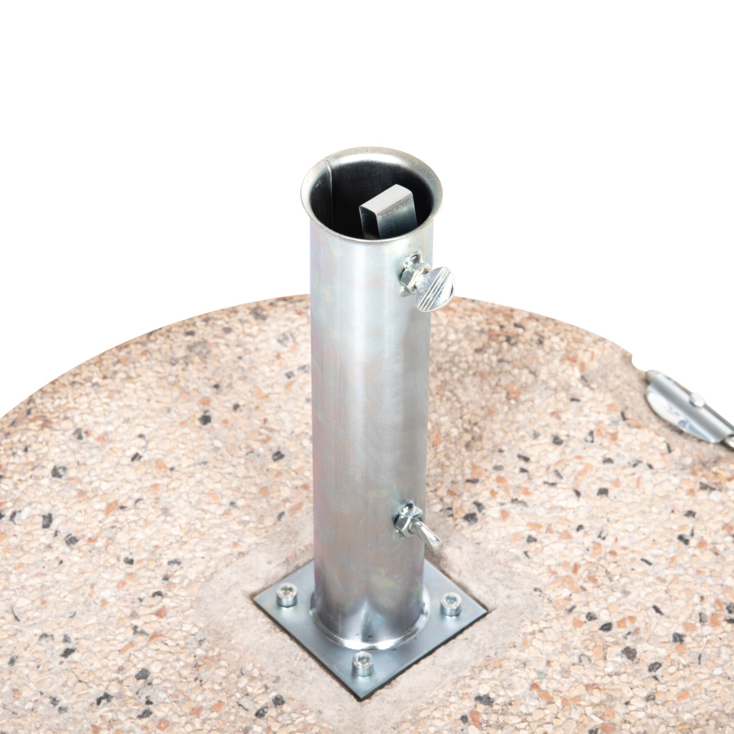 Πρόκειται για μια τσιμεντένια κυκλική βάση για ομπρέλες με σωλήνα διαμέτρου Φ62. Το χαρακτηριστικό αυτής της έκδοσης είναι ότι η σωλήνα υποδοχής της ομπρέλας βιδώνεται στην βάση με 4 βίδες βαρέως τύπου προσδίδοντας απαράμιλλη σταθερότητα και στιβαρότητα. Τέλος, διαθέτει χερούλια μεταφοράς πράγμα το οποίο σας διευκολύνει αρκετά σε περίπτωση που χρειαστεί να την μετακινήσετε.