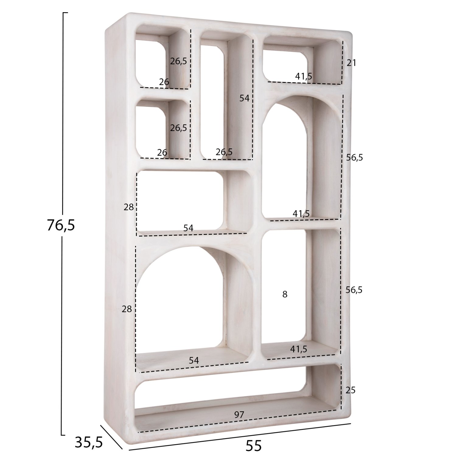 Η βιβλιοθήκη HANDYR είναι εξολοκλήρου κατασκευασμένη από μασίφ ξύλο mango σε ΛΕΥΚΟ χρώμα. Διαθέτει 9 ανοιχτούς χώρους διάφορων μεγεθών για αποθήκευση ή τοποθέτηση αντικειμένων. Αυτή η βιβλιοθήκη είναι κομψή και όμορφη και θα δώσει μια επιπλέον επιλογή για να ολοκληρώσετε την διακόσμησή σας.