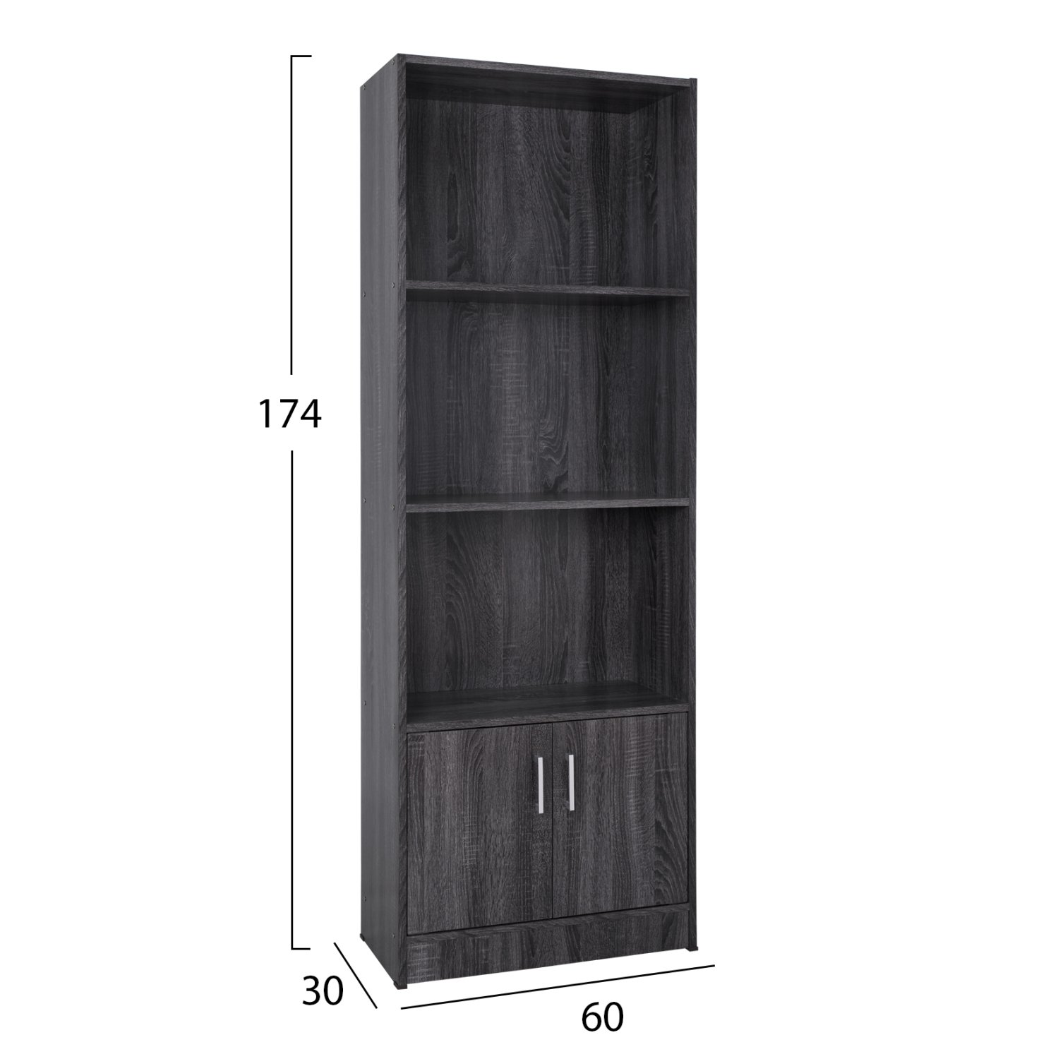 Βιβλιοθήκη γραφείου από μελαμίνη σε ανθρακί απόχρωση, με δύο πόρτες στο κάτω μέρος.